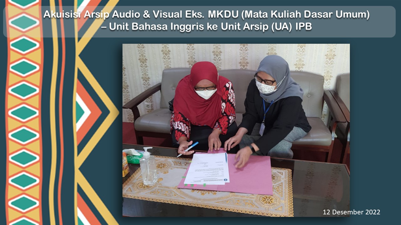 Senin, 12 Desember 2022 Eks. MKDU (Mata Kuliah Dasar Umum) – Unit Bahasa Inggris yang diwakili oleh Ibu Dra. Alfa Chasanah, M.A. menyerahkan arsip audio dan audio visual ke Unit Arsip IPB. Unit Arsip IPB sebagai Lembaga Kearsipan Perguruan Tinggi (LKPT) yang mempunyai tugas dan fungsi (tupoksi) antara lain adalah mengelola arsip statis unit kerja di lingkungan IPB. Arsip audio dan audio visual tersebut memiliki kurun waktu tahun 1966 – 2000, berisi tentang bahan ajar dan soal-soal bahasa inggris berupa listening, reading dan lainnya. Depo arsip IPB menempati gedung eks MKDU, dan arsip tersebut telah berada di gedung eks MKDU sebelum menjadi depo arsip. Karena itu Unit Arsip IPB melakukan koordinasi dengan Dra. Alfa Chasanah, M.A. selaku dosen eks. Unit Bahasa Inggris dan berdiskusi tentang nilai guna arsip audio & audio visual tersebut. Diskusi menghasilkan bahwa arsip audio & audio visual tersebut masih digunakan sewaktu-waktu untuk pengembangan materi terutama untuk materi listening karena tidak ada penambahan. Arsip audio & audio visual akan diserahkan ke Unit Arsip IPB sebagai arsip statis dan sewaktu-waktu dosen mata kuliah bahasa inggris dapat mengakses/meminjam ke Unit Arsip IPB.
