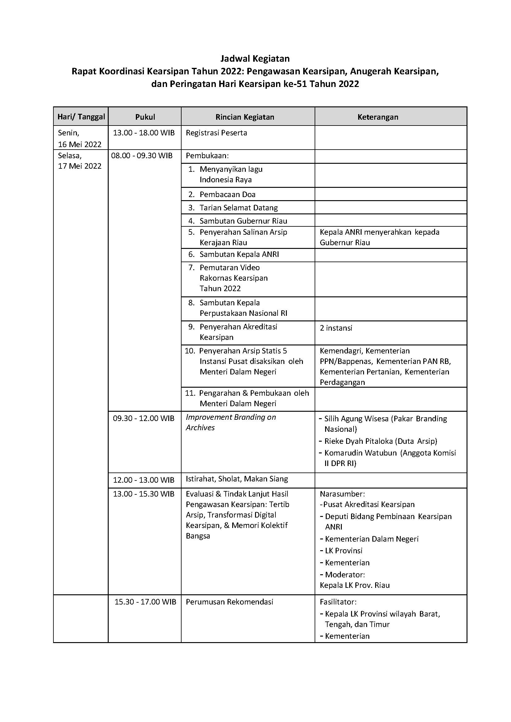Berikut jadwal kegiatan pada Rakor Nasional Evaluasi Hasil Pengawasan Kearsipan: