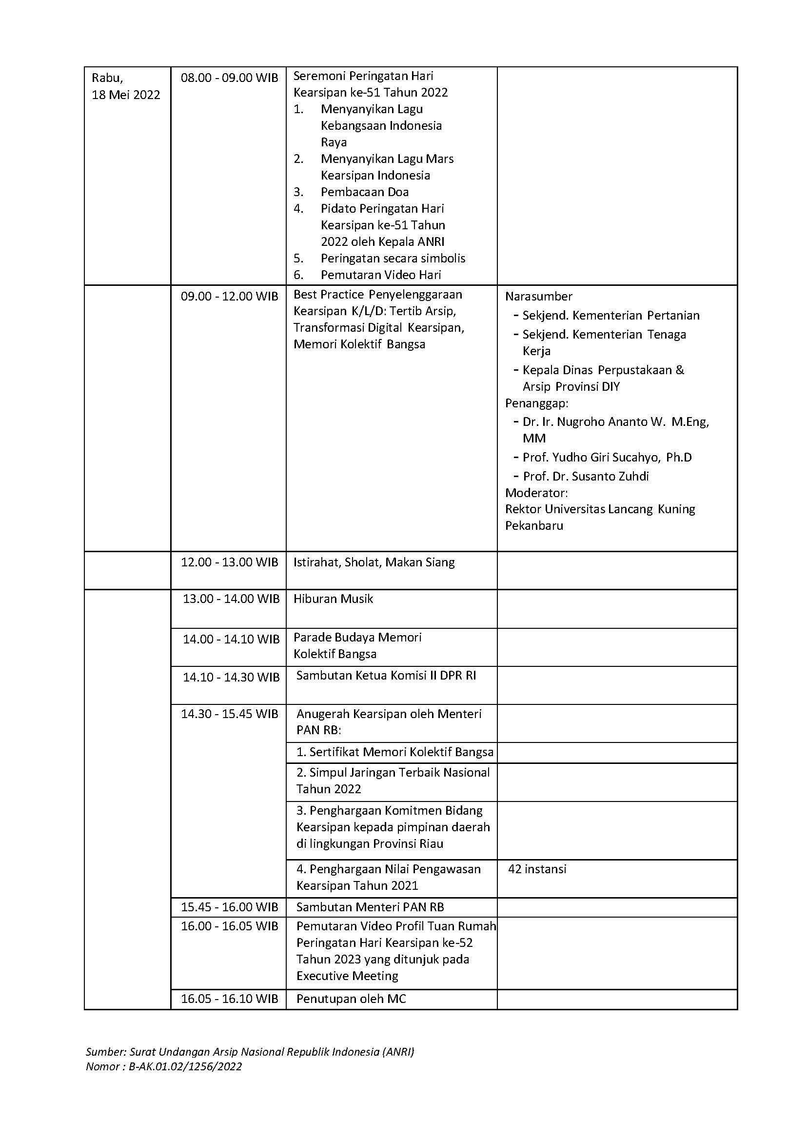 Dalam rangka perbaikan kualitas penyelenggaraan pengawasan kearsipan serta menentukan arah dan tujuan pengawasan ke depan, maka ANRI melaksanakan Rapat Koordinasi Nasional Evaluasi Hasil Pengawasan Kearsipan ini yang dilaksanakan dalam rangkaian peringatan Hari Kearsipan ke-51. Pembukaan Rapat Koordinasi Nasional Kearsipan Tahun 2022 sekaligus dalam rangka peringatan Hari Kearsipan ke-51 dilaksanakan Arsip Nasional Republik Indonesia (ANRI) di Grand Hotel Pangeran, Pekanbaru, Riau. Rakornas Kearsipan Tahun 2022 dibuka oleh Kepala Badan Strategi Kebijakan Dalam Negeri Kemendagri yakni Dr. Eko Prasetyo Peputro, S.Si., M.Si., M.A. yang mewakili Menteri Dalam Negeri, kemudian Drs. Imam Gunarto, M.Hum. sebagai Kepala Arsip Nasional Republik Indonesia (ANRI), serta Gubernur Riau yakni Drs. H. Syamsuar. M.Si.
