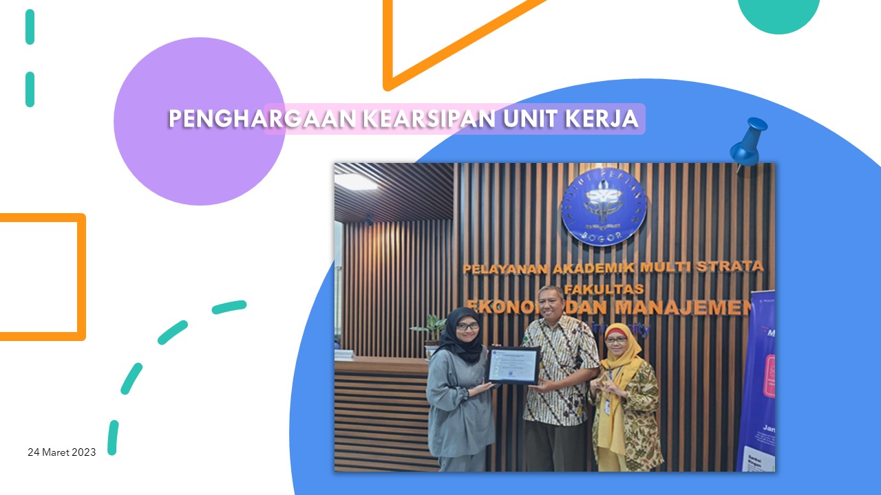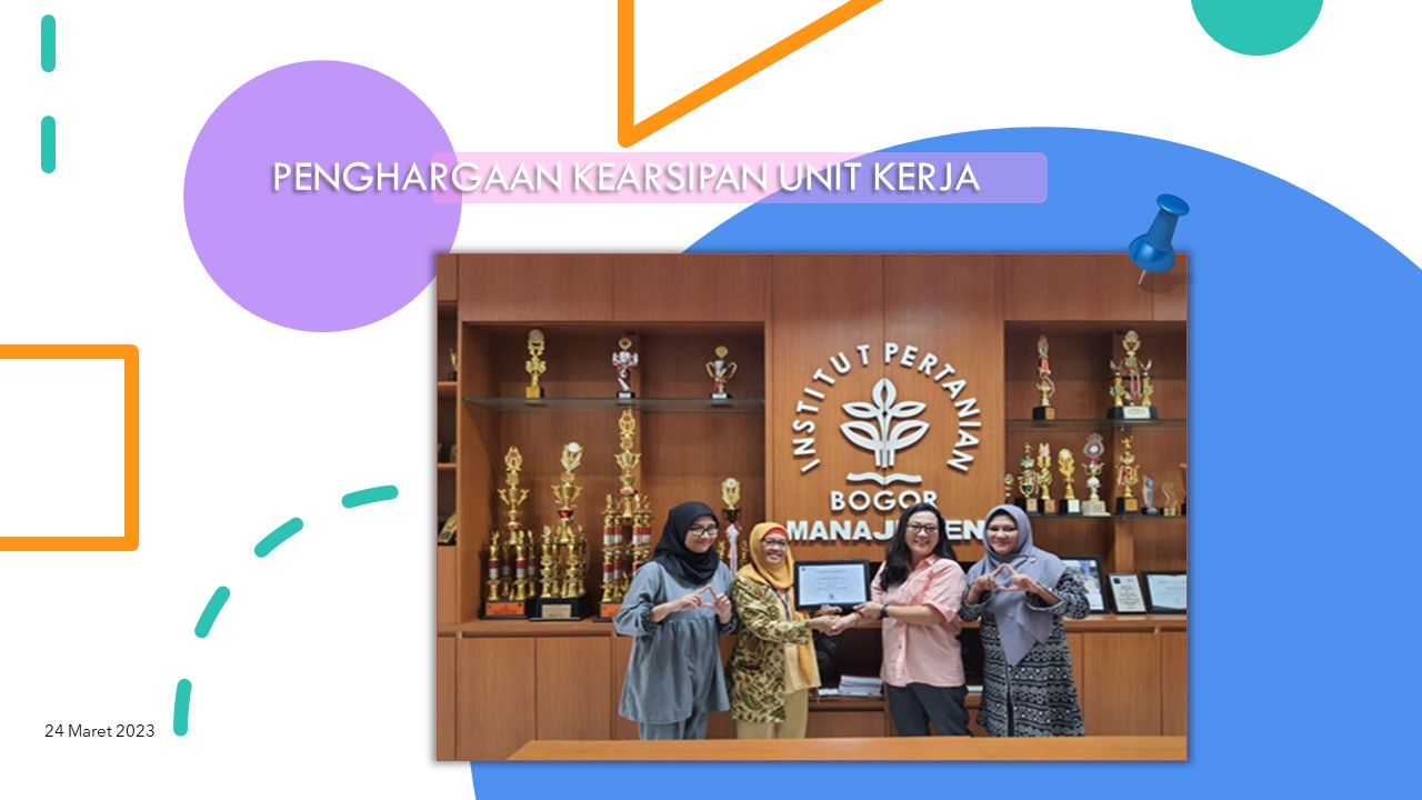 Pada hari Jumat, tanggal 24 Maret 2023, Farhah Faridah, S.E., M.M., Supervisor Pengelolaan Arsip, Lembaga Manajemen Informasi dan Transformasi Digital (LMITD), didampingi oleh Ir. Hirra Nurlaeni, M.M., Supervisor Pengelolaan Museum LMITD, menyerahkan piagam penghargaan Rektor IPB kepada unit kerja yang telah berperan serta dalam Kegiatan Pengawasan Kearsipan tahun 2022 yang dilakukan oleh Arsip Nasional Republik Indonesia (ANRI), sehingga Kearsipan IPB memperoleh predikat SANGAT BAIK. Unit kerja yang mendapatkan penghargaan tersebut dan telah menjadi uji petik kegiatan pengawasan kearsipan tahun 2022 adalah Fakultas Ekonomi dan Manajemen (FEM IPB), Departemen Manajemen FEM IPB, dan Unit Kesehatan IPB.