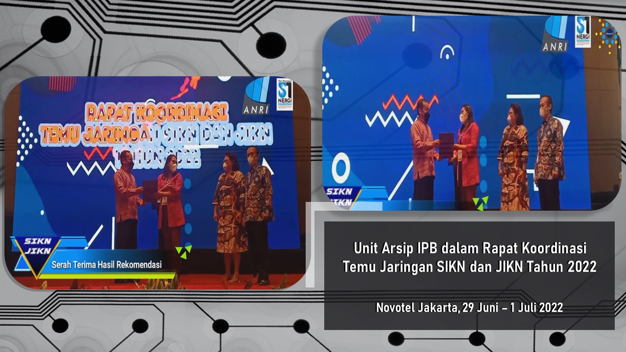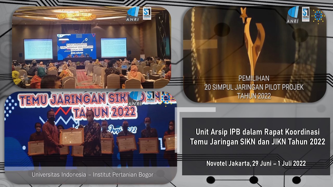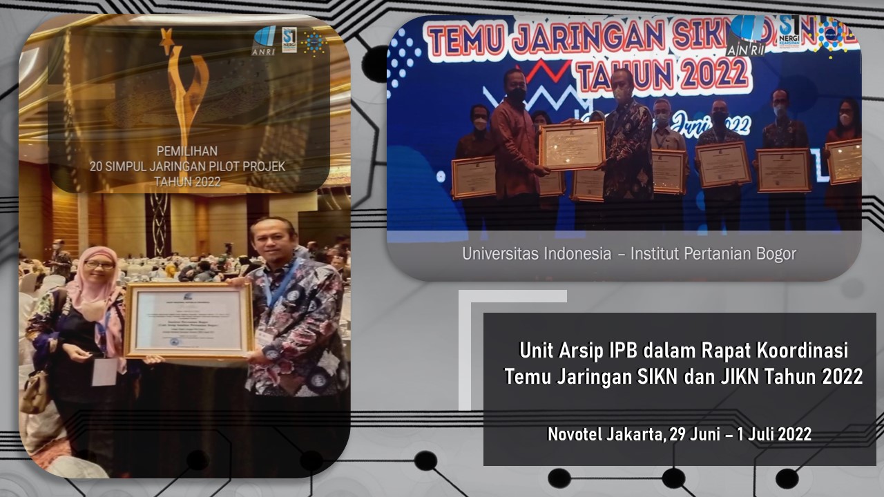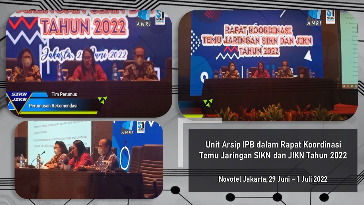 Dalam rangka memperkuat koordinasi nasional antara Pusat Jaringan dengan Anggota Jaringan Informasi Kearsipan Nasional (JIKN) dalam Sistem Informasi Kearsipan Nasional (SIKN), sebagaimana diamanatkan dalam Undang-Undang Nomor 43 Tahun 2009 tentang kearsipan. Arsip Nasional Republik Indonesia (ANRI) melakukan koordinasi nasional dengan menyelenggarakan Rapat Koordinasi Temu Jaringan SIKN dan JIKN Tahun 2022 dengan tema “Penguatan Lembaga Kearsipan dalam SPBE melalui Implementasi SIKN dan JIKN” pada 29 Juni s.d. 1 Juli 2022 bertempat di Hotel Novotel Mangga Dua Jakarta. Institiut Pertanian Bogor (IPB) sendiri yang diwakili oleh Unit Arsip IPB, mengirimkan perwakilan untuk menghadiri Rapat Koordinasi ini. Kepala Unit Arsip IPB, Ir. Setyo Edy Susanto, S.Th.I., M.Pd. dan Ir. Hirra Nurlaeni, M.M. sebagai Supervisor Pembinaan dan Sistem Informasi Kearsipan Unit Arsip IPB turut hadir dalam rangkaian kegiatan ini.